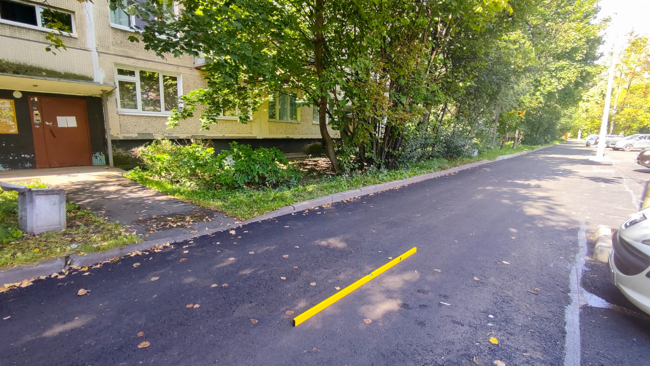 Дворовой проезд у подъезда с уровнем для контроля ровности после асфальтирования