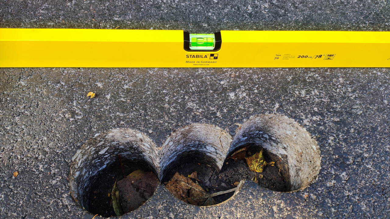 Отверстия после кернения в асфальте рядом со строительным уровнем STABILA