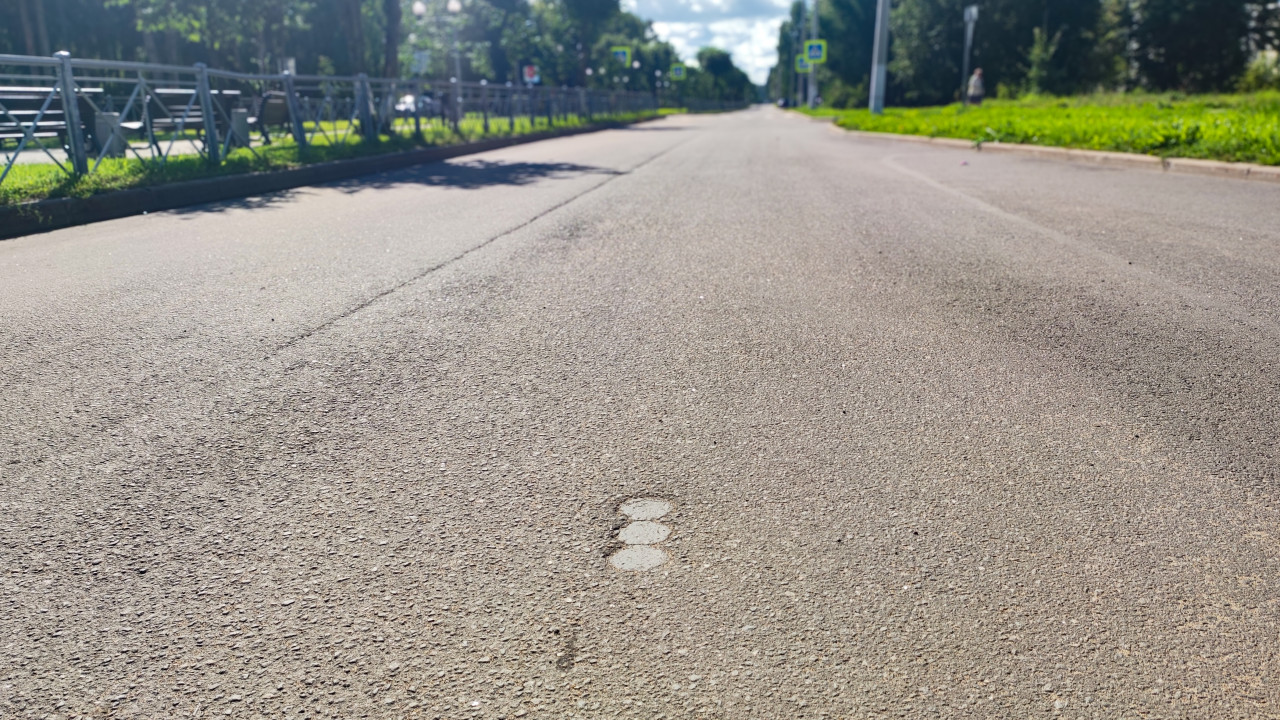 Снимок сделан с очень низкой точки: в фокусе находится поверхность асфальта, хорошо читается зернистая фактура и мелкая каменная крошка дорожного покрытия. Фон кадра сильно размыт, но различимы линия проезжей части, металлическое ограждение вдоль улицы и зелёные насаждения у обочины; вдалеке угадываются дорожные знаки. Дорога выглядит сухой, освещение естественное дневное. Фото подходит как фон для дизайна, а также для материалов о дорогах, покрытии и городской инфраструктуре.