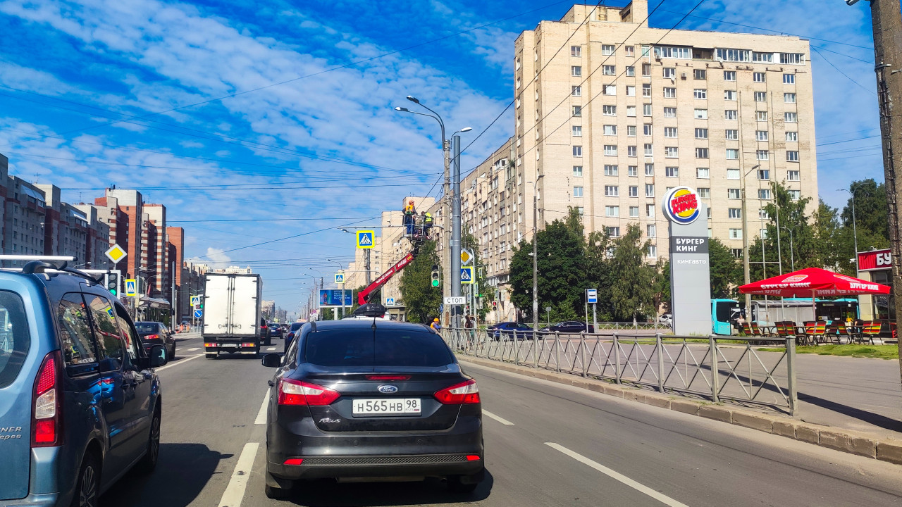 Автовышка у перекрестка и вывеска Burger King на фоне городской магистрали