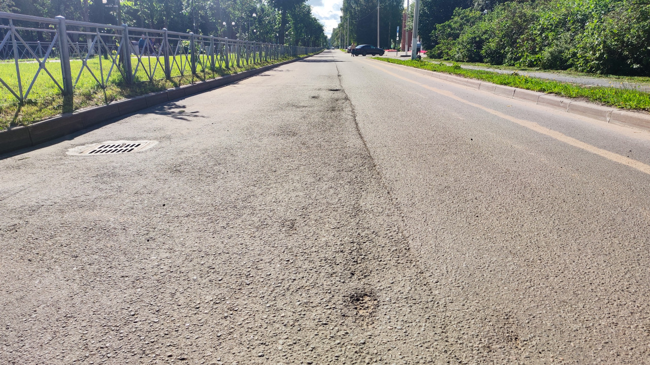 город улица дорога инфраструктура дорожное покрытие асфальт ремонтный шов износ покрытия ливневая канализация ливнёвка решётка ливнёвки дренаж водоотвод бордюр проезжая часть пешеходное ограждение металлическое ограждение тротуар пешеход пешеходная зона зелёная лужайка кусты деревья фонари уличное освещение опоры провода солнечный день городская инфраструктураПохожие фотографии