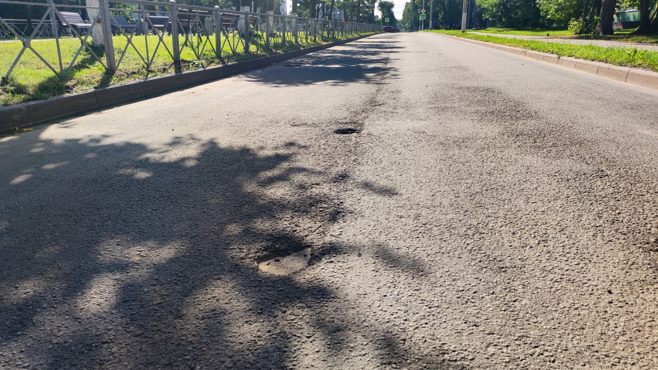 город улица дорога инфраструктура дорожное покрытие асфальт яма выбоина дефекты дороги разрушение асфальта износ трещины стык неровности ремонт дорог содержание дорог безопасность движения опасный участок ограждение металлический забор бордюр обочина тени деревьев зелёная зона дневной свет летний сезон городская инфраструктура урбанистика контроль качестваПохожие фотографии