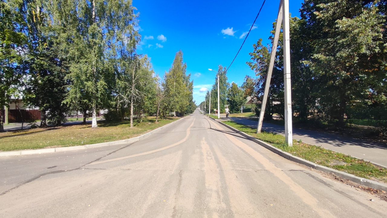 город улица дорога инфраструктура дорожное покрытие асфальт песок на дороге пыль уборка улиц следы шин тротуар бордюр фонари опоры освещения линии электропередачи провода зелёная зона деревья кусты газон частный сектор жилой район забор перспектива городская среда благоустройство качество дорог солнечный день тени спокойная улицаПохожие фотографии