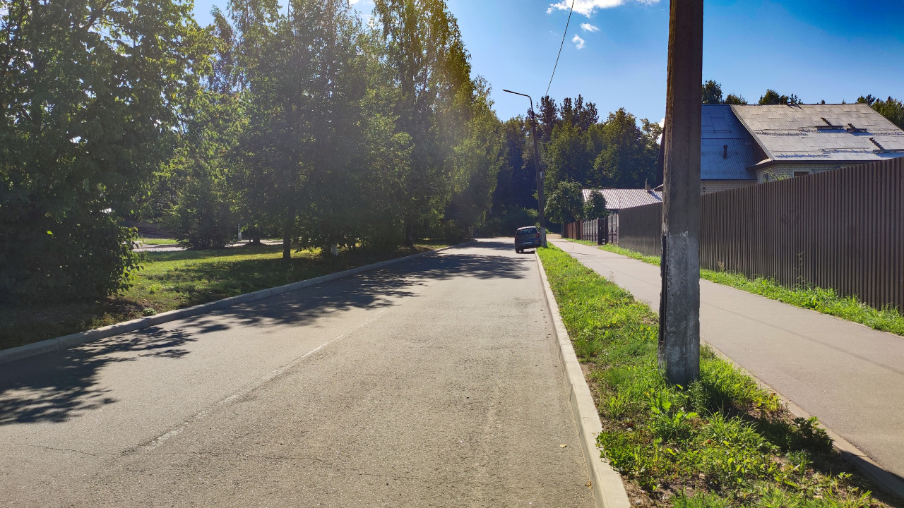 город улица дорога инфраструктура дорожное покрытие асфальт частный сектор жилой район тротуар пешеходная дорожка обочина газон трава забор металлический забор частные дома крыши домов столб опора провода фонари уличное освещение припаркованный автомобиль легковой автомобиль деревья тень солнечно спокойная улица посёлок городская средаПохожие фотографии