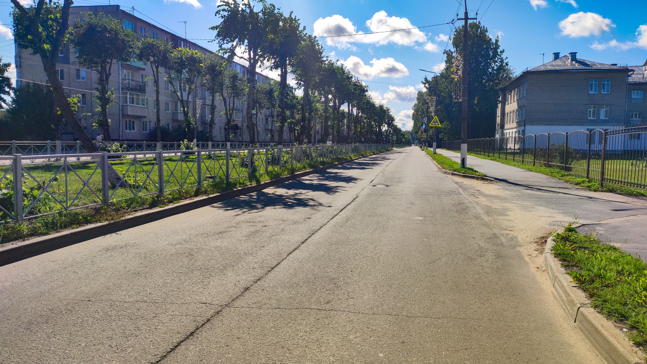 город улица дорога инфраструктура дорожное покрытие асфальт проезжая часть тротуар бордюр газон деревья аллея тени жилые пятиэтажки многоквартирный дом ограждение металлический забор высокий забор кирпичное здание дорожный знак предупреждающий знак уличные фонари опоры провода городская инфраструктура благоустройство перспектива солнечный день голубое небо облака безопасность движенияПохожие фотографии