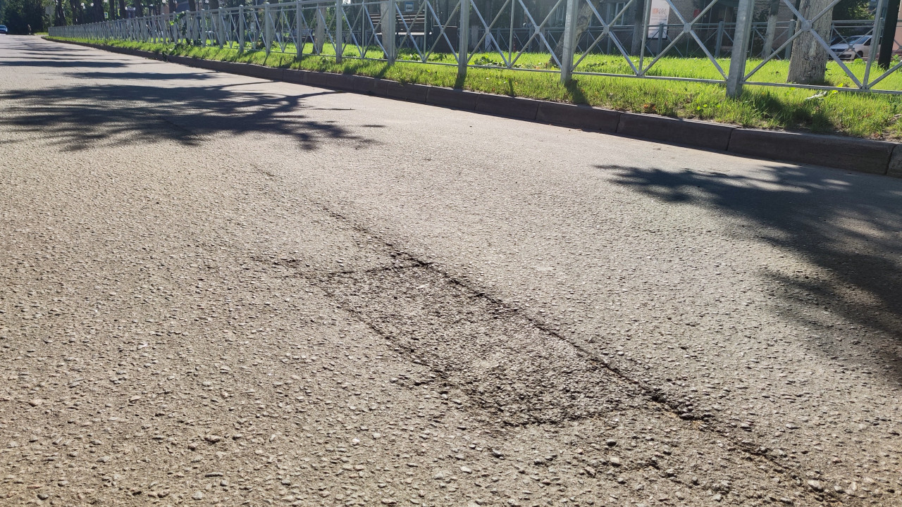 город улица дорога инфраструктура дорожное покрытие асфальт крупный план фактура шов стык заплатка ремонт асфальта дефекты дороги износ сколы крошка трещины неровности диагностика контроль качества обследование содержание дорог городская инфраструктура ограждение металлический забор трава деревья тени солнечный свет обочина бордюр безопасность движенияПохожие фотографии