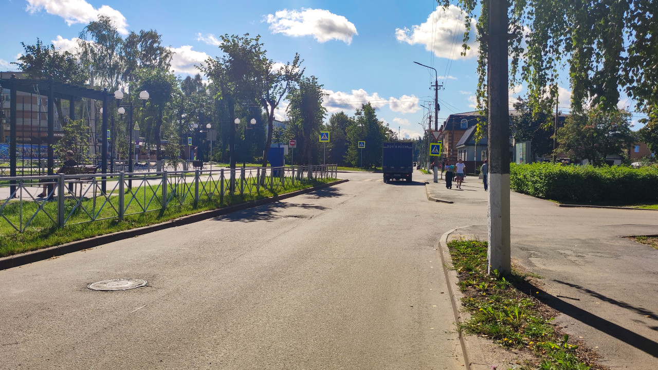 город улица дорога инфраструктура дорожное покрытие асфальт тротуар пешеходный переход дорожный знак знак перехода остановка общественный транспорт грузовик почтовый автомобиль Почта России доставка городская логистика служебный транспорт жилой район жилые дома деревья зелёная зона ограждение уличные фонари лавочки городская инфраструктура движение безопасность дневной свет ясная погодаПохожие фотографии