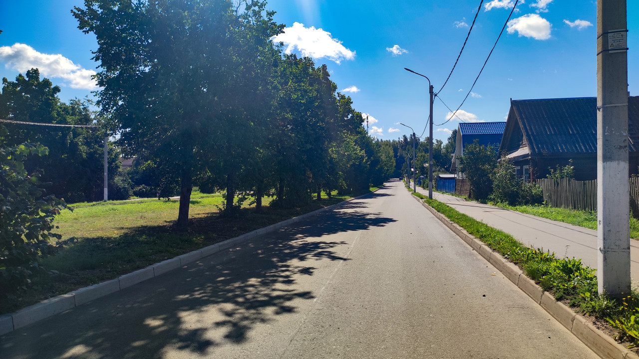 город улица дорога инфраструктура дорожное покрытие асфальт тротуар бордюр частный сектор поселок загородная улица зеленые насаждения деревья кустарники газон обочина уличное освещение фонари столбы линии электропередачи провода перспектива дорожное полотно пешеходная зона благоустройство городская среда дневной свет лето небо облакаПохожие фотографии