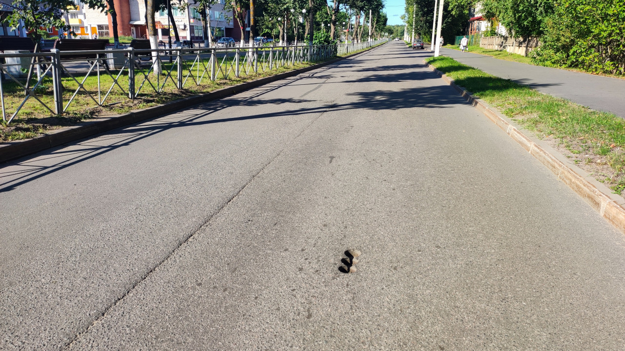 Длинная перспектива улицы с ограждением, деревьями и пятнами ремонта на асфальте