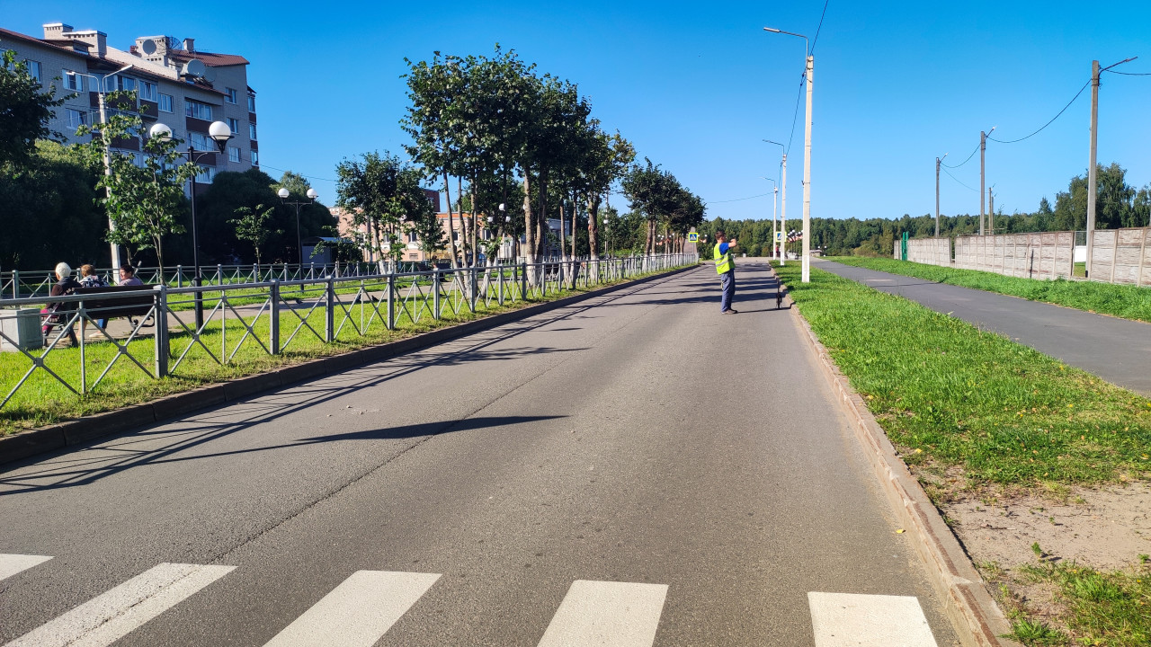 город улица дорога инфраструктура дорожное покрытие широкая проезжая часть пешеходный переход зебра разметка дорожные знаки тротуар бордюр асфальт ограждение лавочки люди деревья многоэтажный дом измерение замеры измерительное колесо курвиметр полевые работы инженер рабочий сигнальный жилет дорожные работы благоустройство контроль городская инфраструктураПохожие фотографии