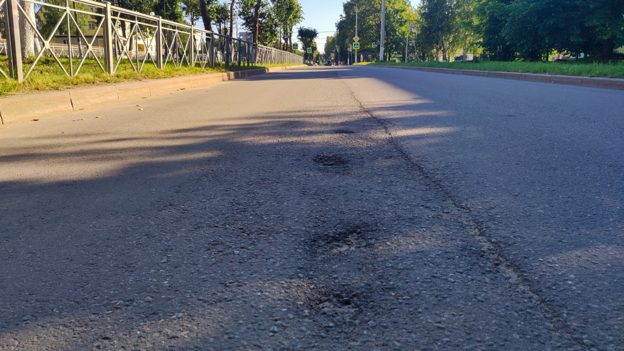 город улица дорога инфраструктура дорожное покрытие асфальт износ дефект выбоины ямы заплатки продольный шов трещины крошка асфальта шероховатая фактура ремонт дороги дорожные работы обследование диагностика контроль качества технадзор городская инфраструктура бордюр ограждение зелёная полоса деревья тени знак пешеходный переход перспективаПохожие фотографии