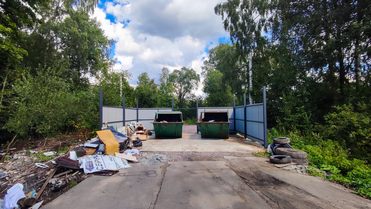 Грунтовая подъездная дорога к ограждённой контейнерной площадке с мусором и шинами у леса