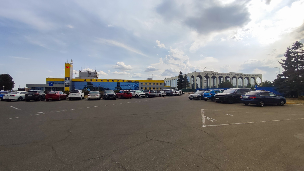 Фасад международного аэропорта Ставрополь с парковкой и вывеской