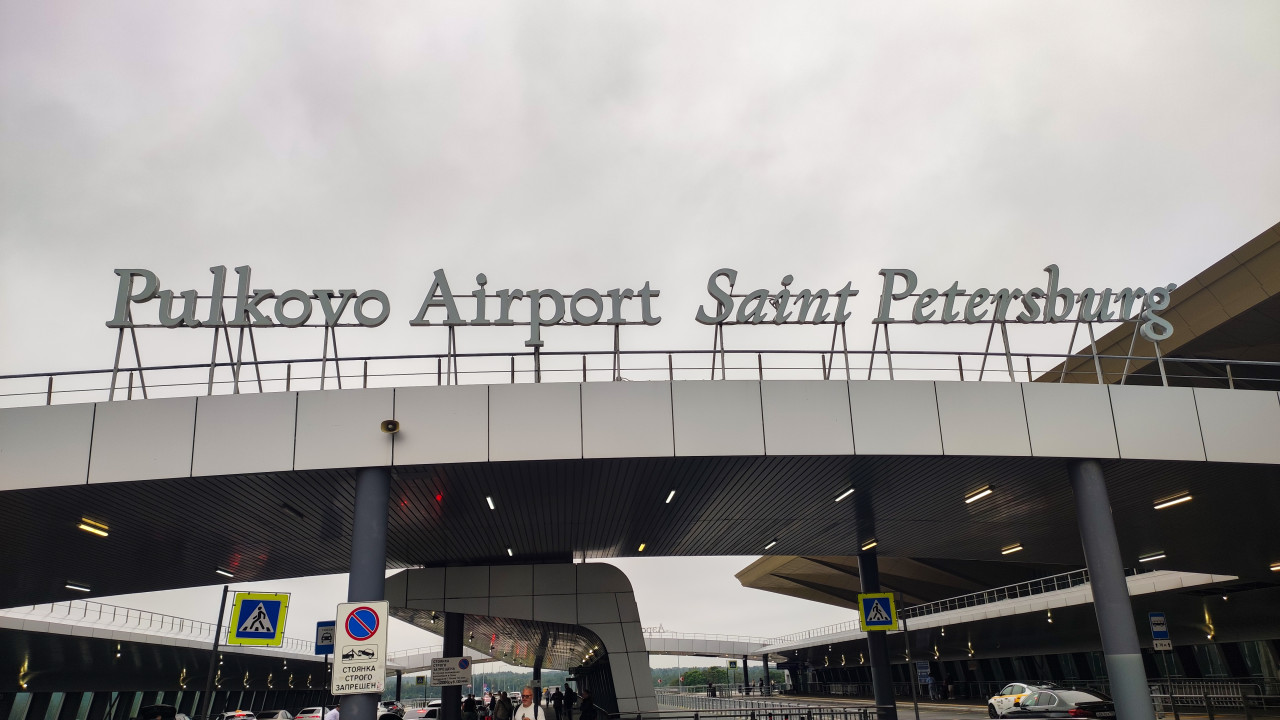 Крупный план фасада аэропорта: на фоне светлого пасмурного неба видна часть здания и широкий козырёк с металлическими опорами, а сверху читается надпись Pulkovo Airport Saint Petersburg. Под навесом расположена зона подъезда к терминалу с освещением, дорожными знаками и элементами навигации, где высаживают пассажиров и разгружают багаж. Пулково, главный аэропорт Санкт-Петербурга, работает с 1930-х годов и обслуживает внутренние и международные рейсы; современный терминал легко узнать по широкой кровле и сочетанию стекла с металлом. Фото подойдёт для тем про авиаперелёты, путешествия, транспортные узлы и городскую инфраструктуру.