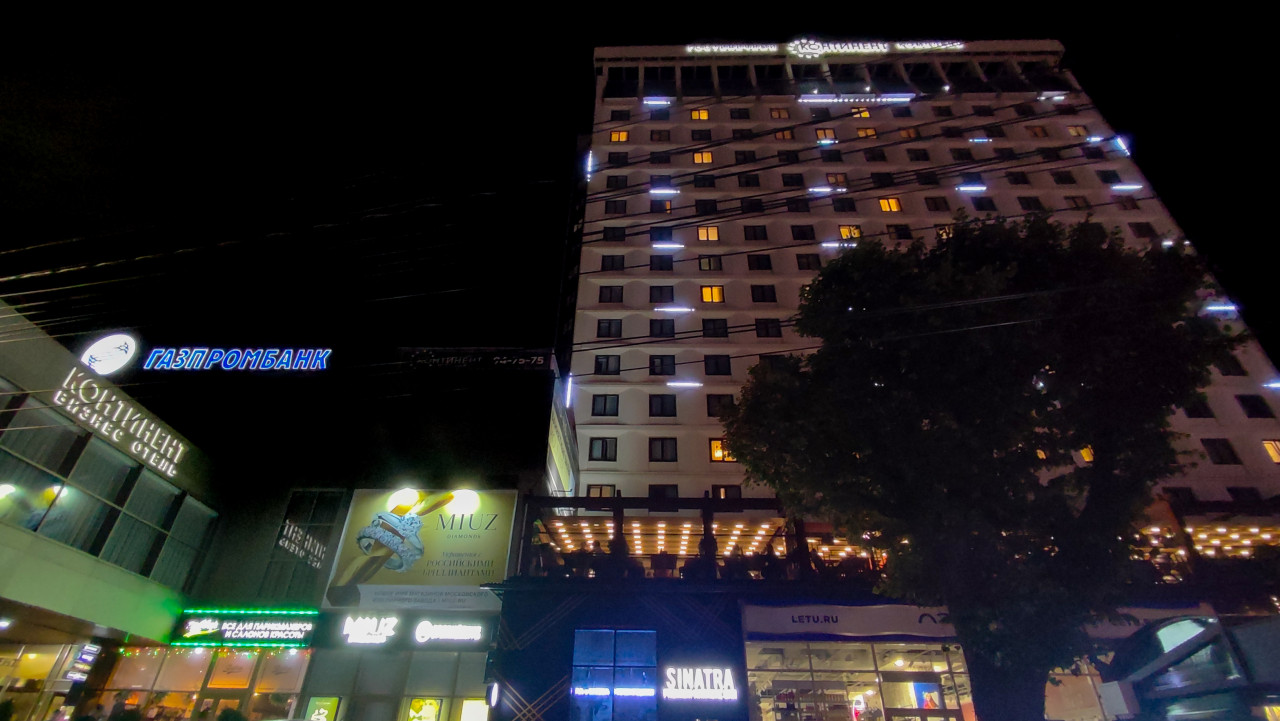 город архитектура здание фасад коммерческое здание вывеска окна вход улица городская среда уличное освещение подсветка вечер ночь ночной город многоэтажное здание высотка городской пейзаж коммерческая недвижимость офисы витрины магазины вывески реклама баннер подсветка фасада фонари городская улица деревья в городе городской центр урбанистика Gazprombank MIUZ Diamonds LETU RU SINATRA торговый квартал вечерняя съёмкаПохожие фотографии