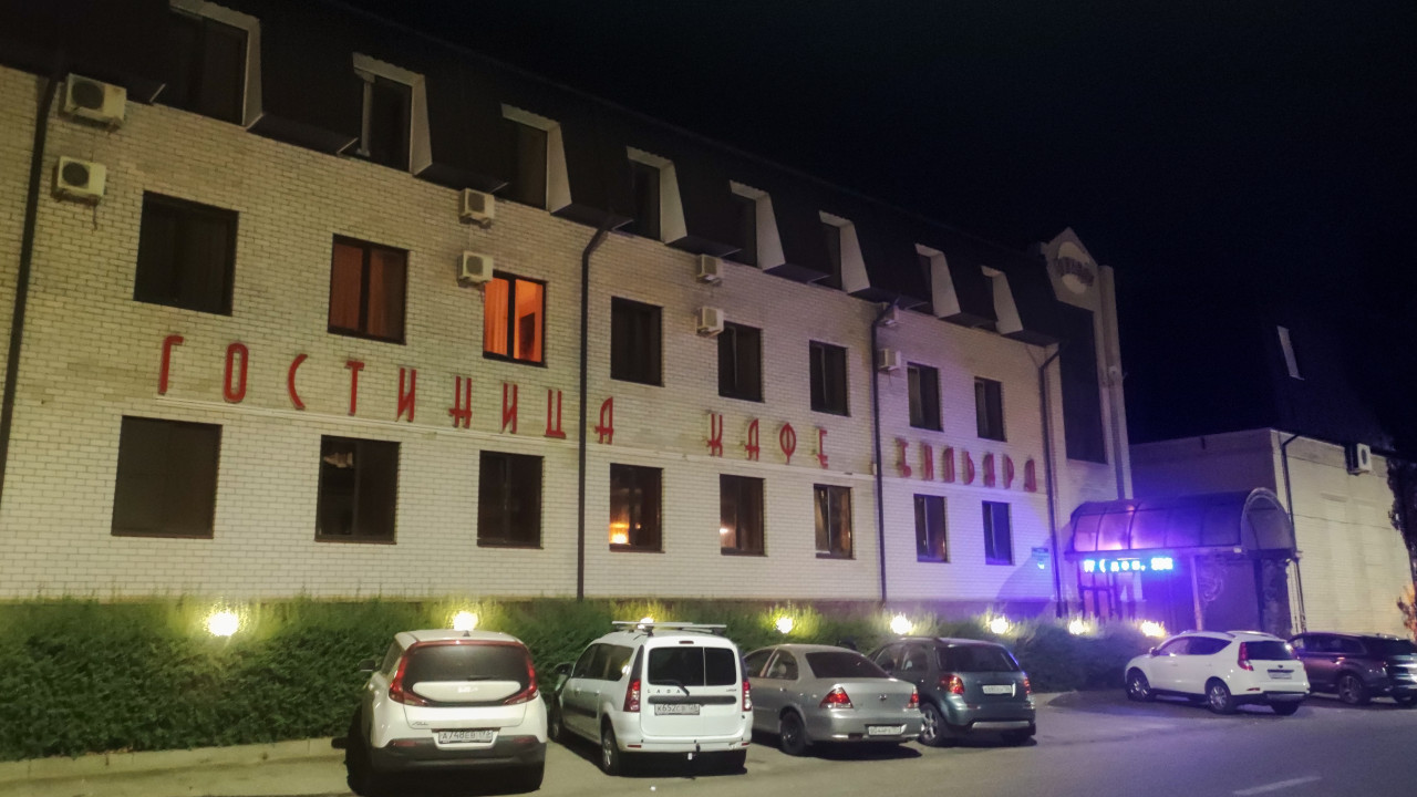 Ночной фасад гостиницы, вывеска «ГОСТИНИЦА» и парковка