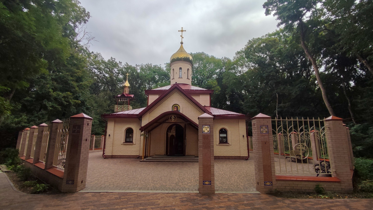 Камера смотрит прямо на вход в православный храм: светлый фасад с арочным порталом, окнами и иконным изображением над дверью, сверху золотой купол с крестом. Двор вымощен плиткой, по периметру стоит ограда с кирпичными колоннами и металлическими секциями, створки ворот распахнуты. Слева видна аллея и дорожка, вокруг плотные деревья, небо серое и низкое. Композиция строгая и симметричная, хорошо подходит для иллюстрации религиозной архитектуры и благоустроенных храмовых территорий. Использование: путеводители, краеведение, материалы о православных приходах.