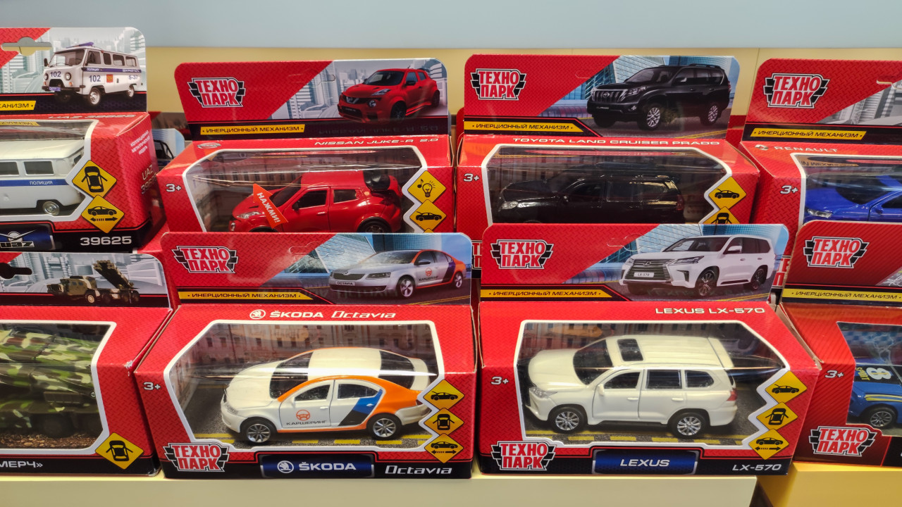 торговля розница магазин витрина стеллаж полка товары ассортимент детские товары игрушки подарки выбор покупки детские игрушки машинки модели автомобилей миниатюры упаковка коробка блистер выкладка ценники штрих код потребительские товары детский подарок коллекция автотранспорт бренд Технопарк товарная полка выбор игрушекПохожие фотографии