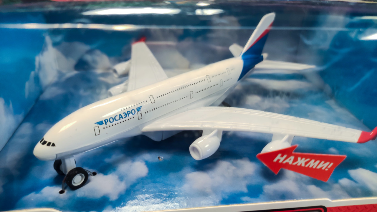 Игрушечный самолёт «РОСАЭРО» за прозрачным окном коробки
