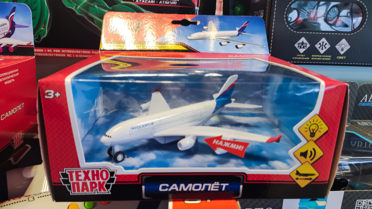 Игрушечный самолёт «РОСАЭРО» за прозрачным окном коробки