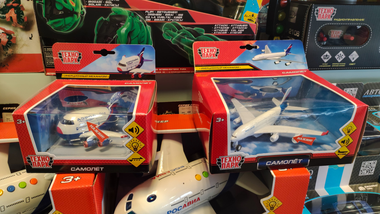 торговля розница магазин витрина стеллаж полка товары ассортимент детские товары игрушки подарки выбор покупки игрушка детская игрушка самолёт авиалайнер игрушечный самолёт упаковка коробки Технопарк ТЕХНОПАРК стрелка нажми свет звук пиктограммы инерционный механизм РОСАВИА РОСАЭРО детский транспорт авиация подарок выбор подарка товарная выкладкаПохожие фотографии