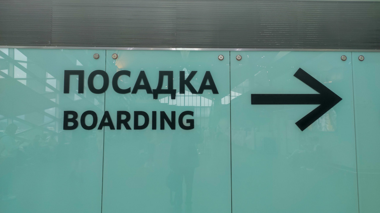 транспорт аэропорт терминал навигация указатель табличка знак ориентирование общественное пространство инфраструктура путешествия посадка boarding стрелка вправо проход маршрут пассажира информационный дизайн двуязычие русский язык английский язык стеклянные панели швы крепления интерьер отражения минимализм типографика навигационная система ожидание вылетПохожие фотографии