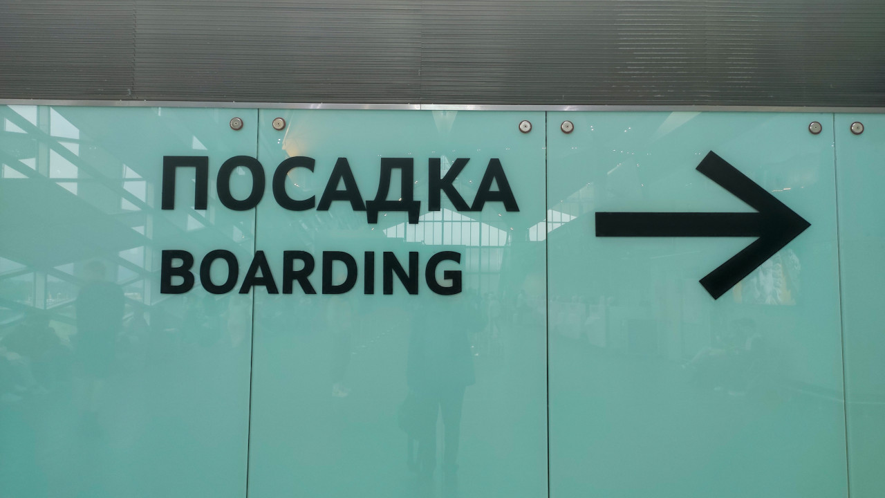 транспорт аэропорт терминал навигация указатель табличка знак ориентирование общественное пространство инфраструктура путешествия посадка boarding стрелка направление информационная система двуязычная надпись русский текст английский текст стеклянная перегородка матовое стекло крепёж винты отражения интерьер современный дизайн типографика ожидание рейса пассажирПохожие фотографии