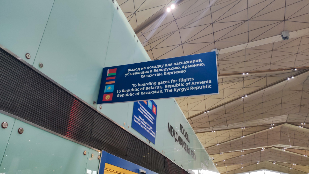 транспорт аэропорт терминал навигация указатель табличка знак ориентирование общественное пространство инфраструктура путешествия международные рейсы посадка выход на посадку подвесная табличка флаги страны Белоруссия Армения Казахстан Киргизия направления информационная система двуязычие русский текст английский текст интерьер аэропорта высокий потолок геометрия освещение пассажирыПохожие фотографии
