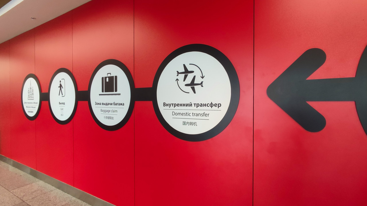 Красная стена с круглыми пиктограммами: выход, багаж и внутренний трансфер