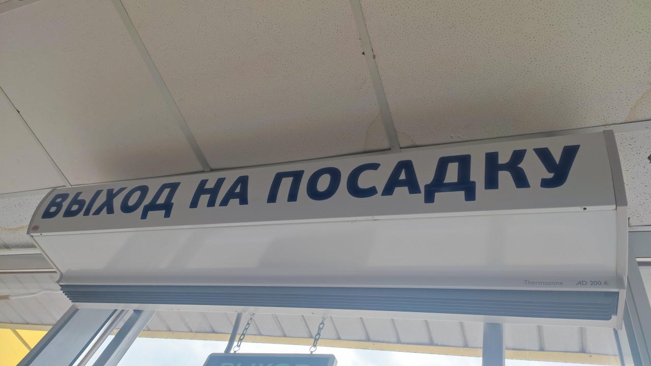 Снято внутри терминала: под потолком из белых плит висит длинный короб с крупной надписью «ВЫХОД НА ПОСАДКУ». Под ним установлен светильник или световой модуль, а ниже видна верхняя часть оконного проёма и дневное небо с облаками. Ракурс подчёркивает конструкцию креплений, ровные линии потолка и чистую функциональную отделку, типичную для транспортных узлов. Такой кадр хорошо работает в материалах про аэропортовую навигацию, инфраструктуру терминалов, сервис и организацию проходов к посадке.