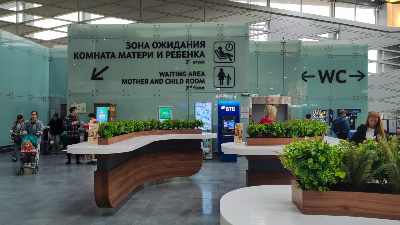 общественное пространство транспорт аэропорт терминал интерьер пассажиры путешествия авиация инфраструктура сервис навигация указатели информационные таблички зона ожидания комната матери и ребенка WC туалет стеклянные перегородки дизайн стойки столешницы растения кашпо банкомат VTB вендинговые автоматы коляска чемоданы ожидание рейса транспортный узелПохожие фотографии