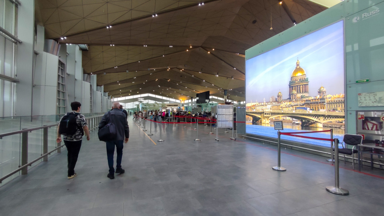 Внутри терминала Пулково люди идут по просторному залу мимо большого экрана
