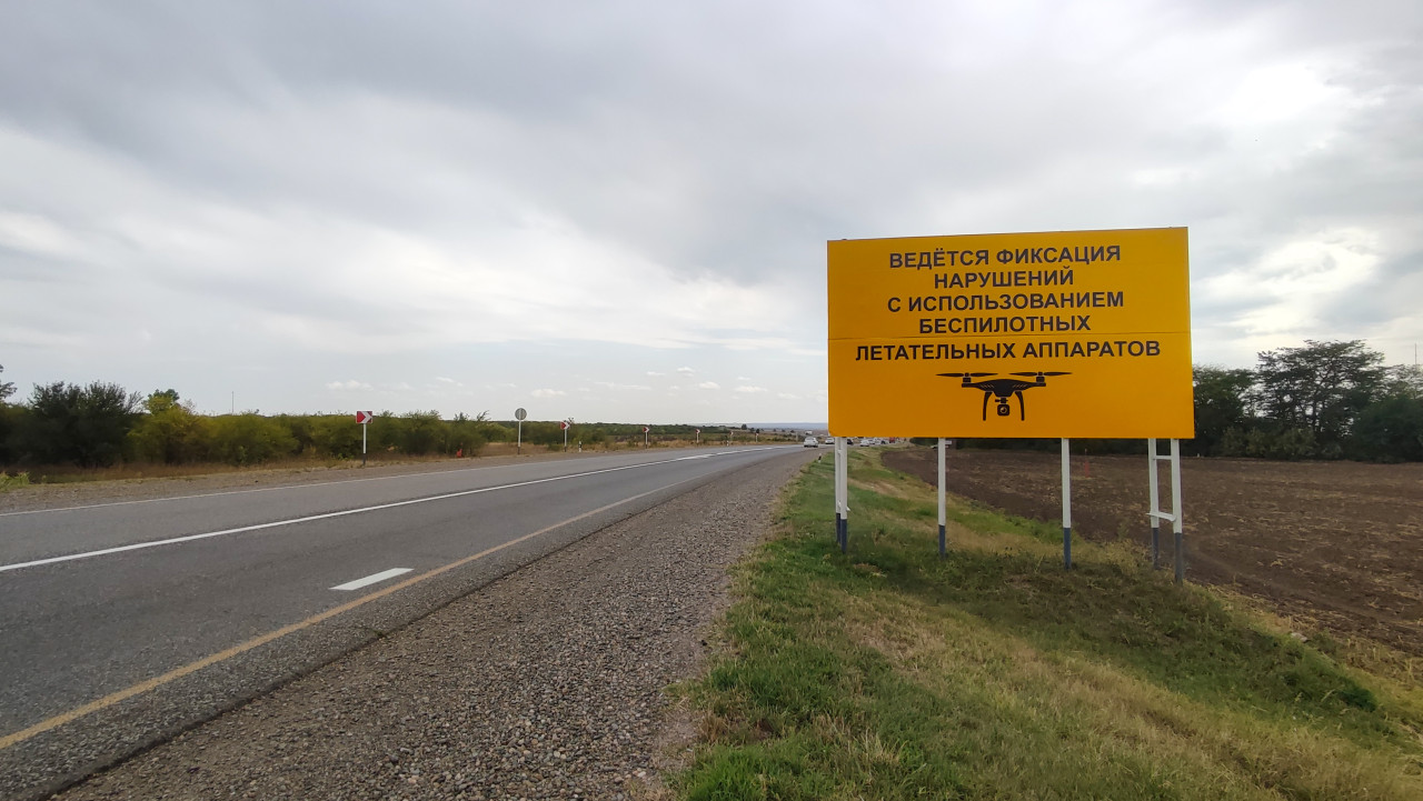 Дорожный щит о фиксации нарушений ПДД с беспилотника на пустынном участке трассы