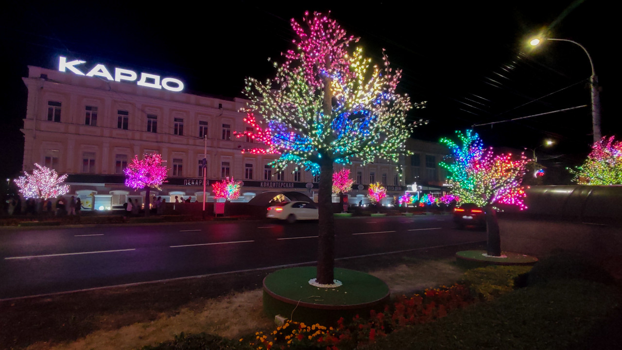 Ночная городская улица с декоративной подсветкой: вдоль проезжей части стоят световые «деревья» с разноцветными гирляндами на круглых зелёных основаниях. У края кадра заметны тротуар, низкие клумбы, бордюры и элементы ограждения, на асфальте ловятся цветные отражения. В потоке едут легковые машины, вдали светятся витрины и вывески. На фоне подсвеченный фасад с надписью «КАРДО», уличные фонари и тёмное небо. Фото можно использовать в материалах про городскую иллюминацию, вечерние прогулки, благоустройство и туристические маршруты.