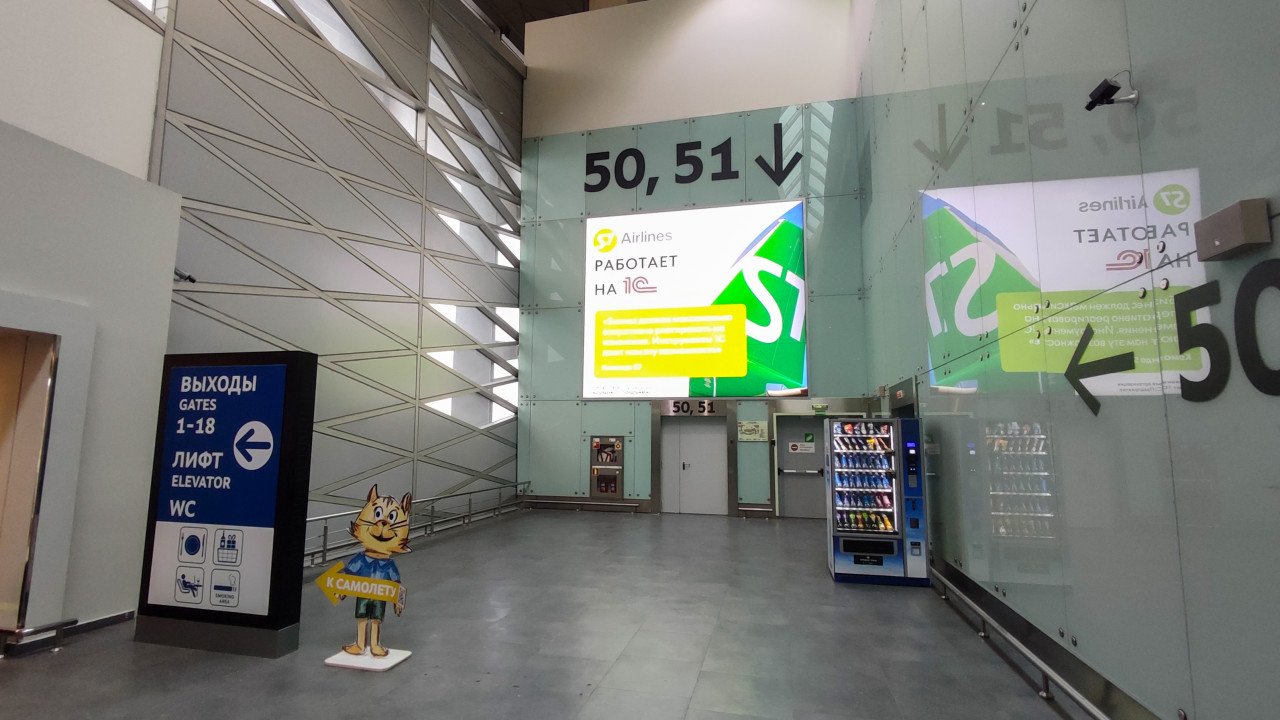 общественное пространство транспорт аэропорт терминал интерьер пассажиры путешествия авиация инфраструктура сервис коридор современная архитектура стекло отражения навигация указатели гейты номера гейтов 50 51 стрелка информационная стойка лифт WC вендинговый автомат напитки реклама медиаэкран S7 Airlines 1C камера наблюдения поручни ожиданиеПохожие фотографии