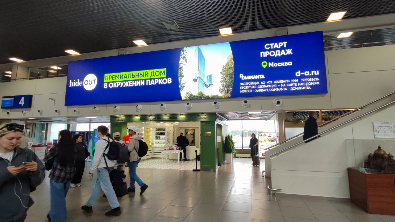 Внутренний зал аэропорта с крупным рекламным экраном hideOUT: на баннере текст про «старт продаж» и несколько визуальных блоков, экран закреплён над проходом к магазинам. Внизу видны вывески торговых точек, стеклянные витрины, стойки и поток людей. Интерьер светлый: ровный потолок с лампами, колонны, отражения в стекле. На переднем плане часть ограждений и указателей, вокруг типичная суета терминала без постановки. Фото можно использовать для материалов о рекламе в общественных пространствах, медиаэкранах и торговых зонах аэропортов.