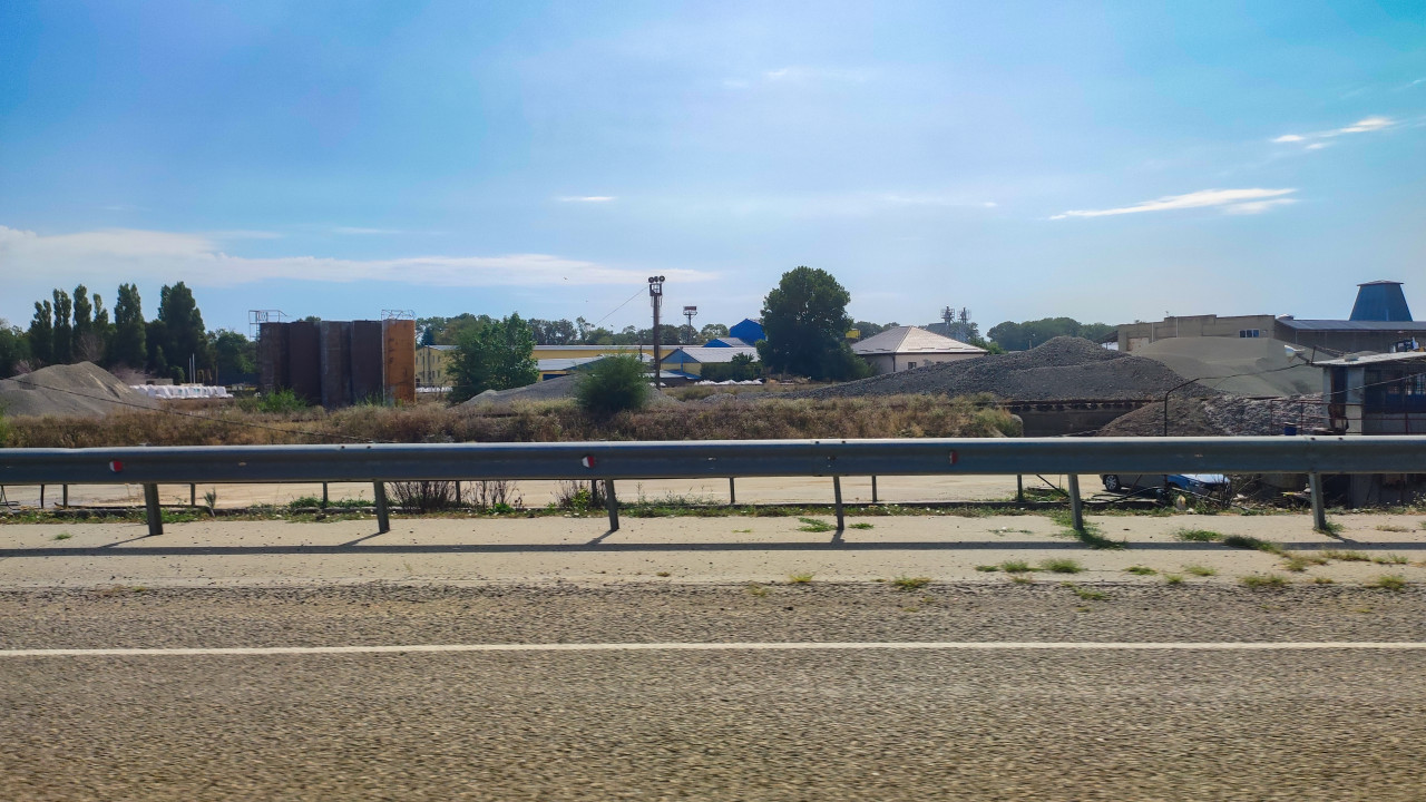 Съёмка с трассы: на переднем плане фактура асфальта и металлический отбойник, за ним открывается территория с кучами сыпучих материалов. Хорошо различимы насыпи щебня и песка разных оттенков, рядом стоят складские строения и высокие вертикальные ёмкости, а по краю площадки тянется полоса кустов и деревьев. Пространство сухое и пыльное, с широким горизонтом и большим количеством неба. Фото подходит для тем про стройматериалы, поставки инертных материалов, промбазы и логистику, а также для сайтов строительных компаний и новостных заметок о дорогах.