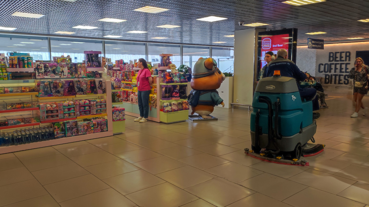 Зал аэропорта с магазином игрушек и уборочной машиной