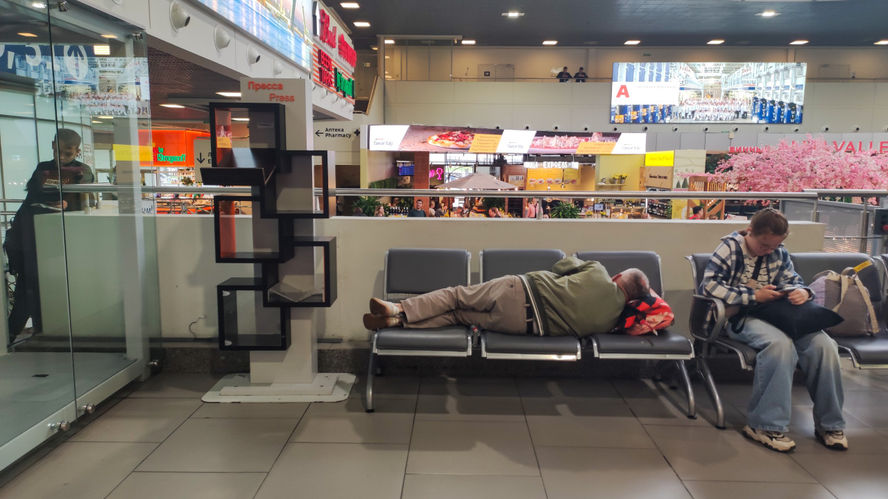 Люди отдыхают на лавке в зале ожидания аэропорта под указателями «Пресса» и «Аптека»