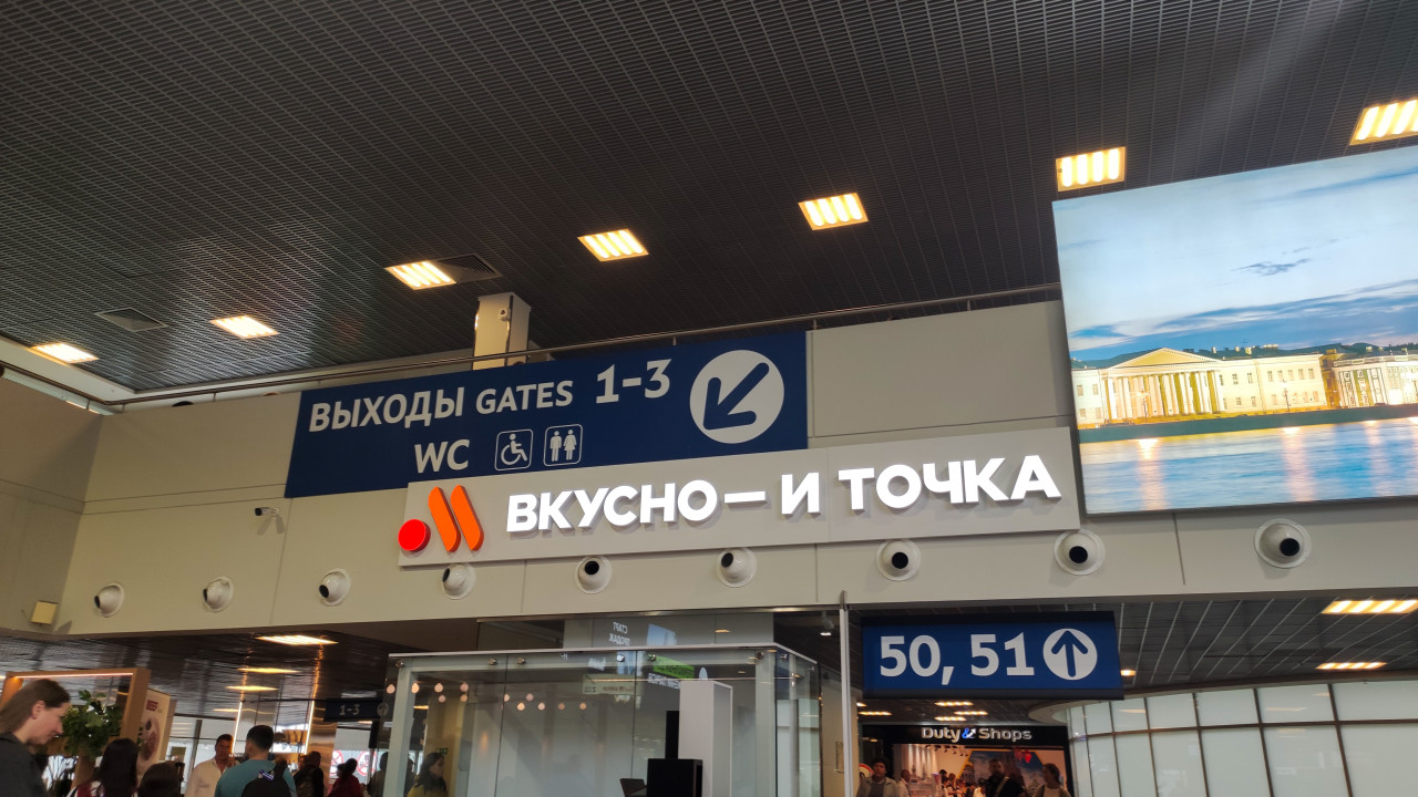 Указатель «Выходы 1–3» рядом с вывеской «Вкусно и точка» в терминале аэропорта