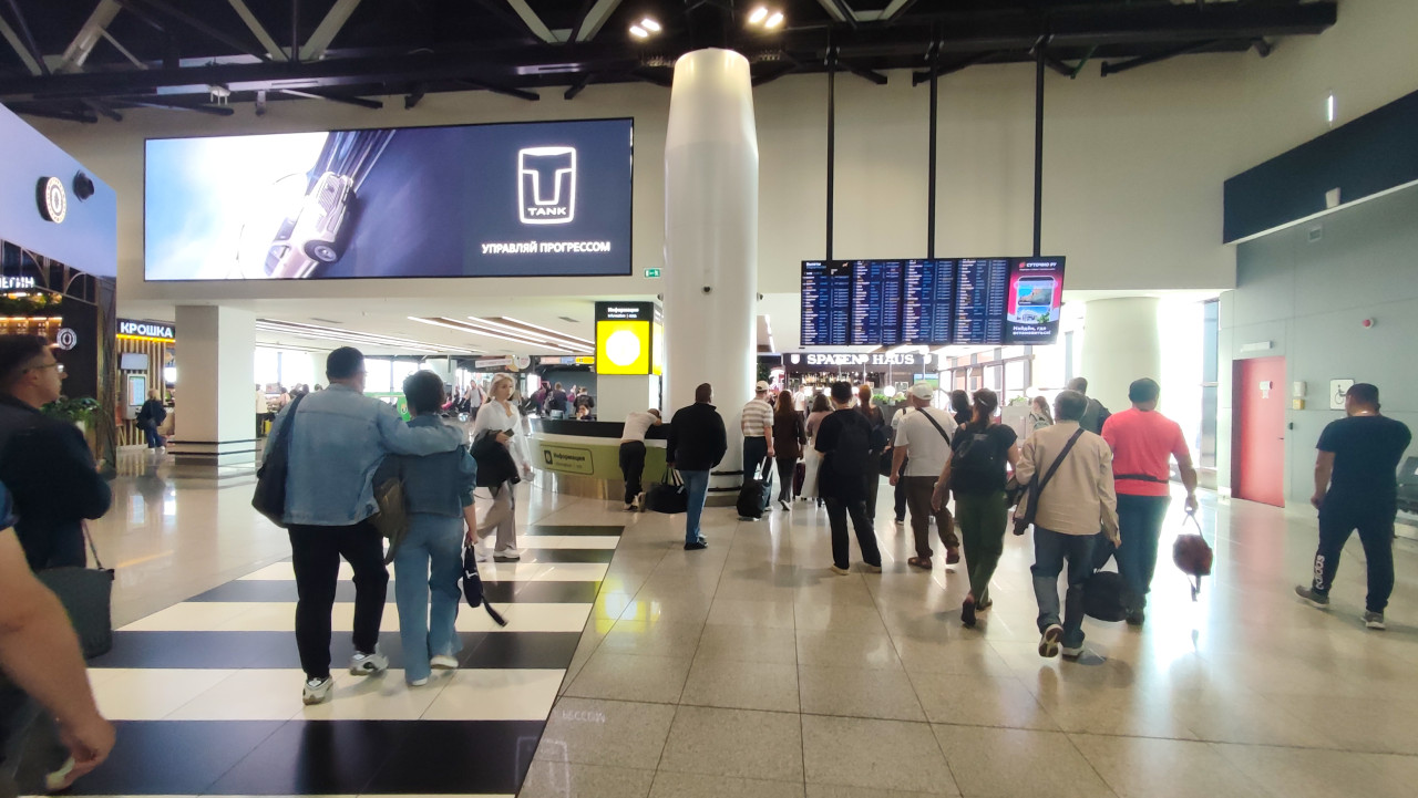 общественное пространство транспорт аэропорт терминал интерьер пассажиры путешествия авиация инфраструктура сервис зал ожидания чемоданы багаж табло рейсов расписание навигация указатели реклама рекламный баннер TANK автомобильная реклама транспортный узел проход очередь стойки ограждения современная архитектура стекло световой экран городская логистикаПохожие фотографии