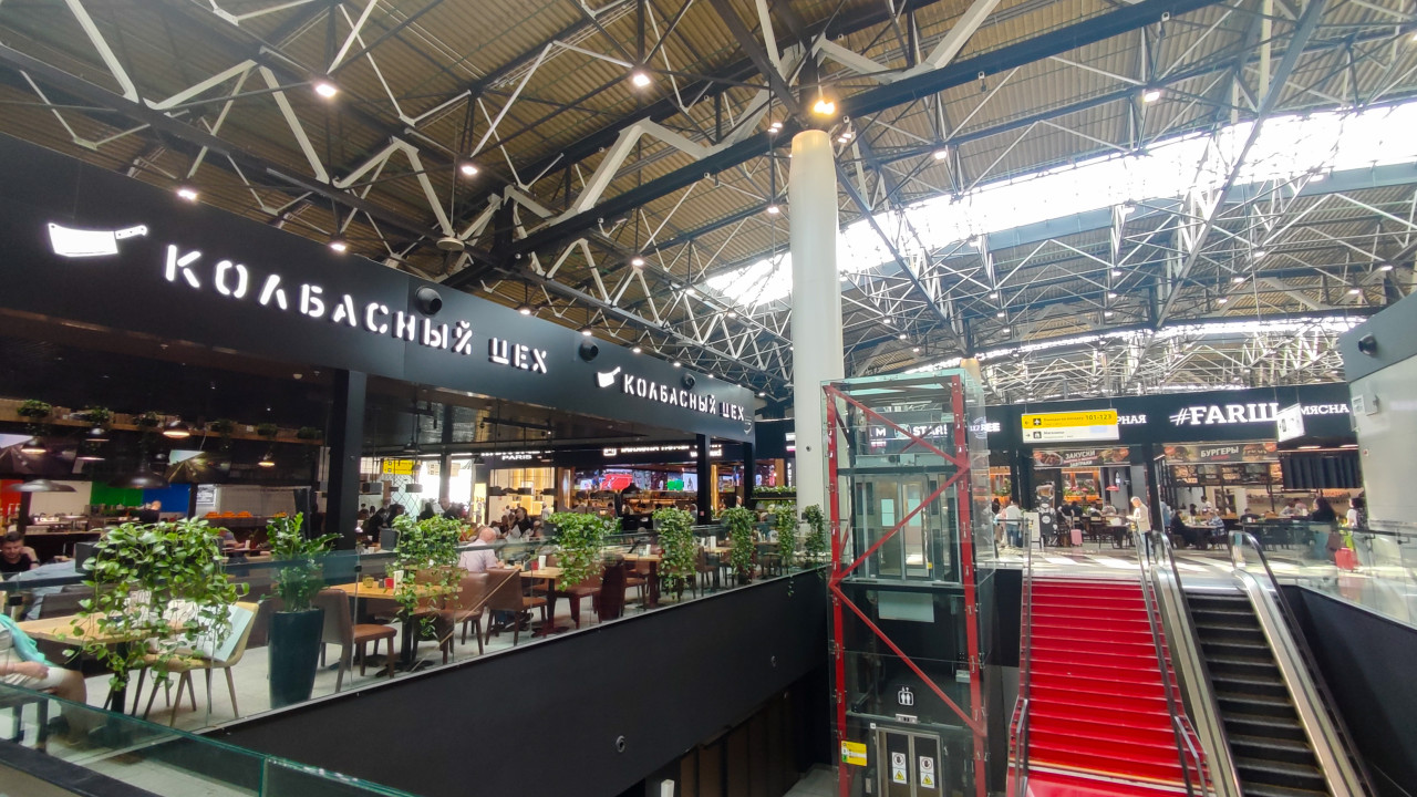 Фудкорт терминала: вывески «Колбасный цех» и #FARШ, лестница и эскалатор