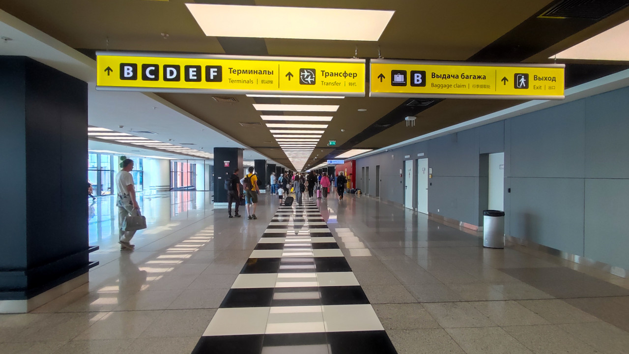 Просторный переход аэропорта снят в перспективе: по центру идёт тёмная направляющая полоса на светлом полу, по бокам стоят и идут пассажиры с сумками и чемоданами. Над головой висят жёлтые указатели со стрелками и пиктограммами, указывающие направления к выходу, багажу и пересадке на другие терминалы. Стены и потолок отделаны светлыми панелями, освещение равномерное, справа видны стеклянные перегородки и металлические ограждения. Фото подходит для тем про пассажиропотоки, навигацию и интерьер транспортных узлов.