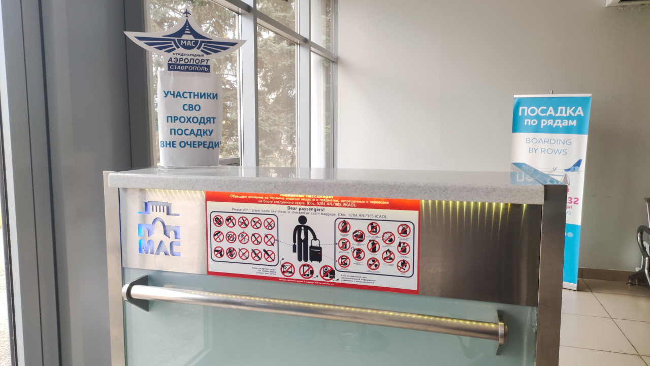 Снимок сделан внутри здания аэропорта: видна стойка информации с табличкой «Аэропорт Ставрополь», за ней стеклянные перегородки и зона обслуживания. На стенах размещены баннеры с правилами посадки по рядам и информационные плакаты, рядом стоят кресла ожидания и элементы навигации. Освещение искусственное, интерьер выдержан в нейтральных тонах, пространство выглядит функциональным и «служебным». Фото подходит для материалов про пассажирские перевозки, работу аэропортов, сервис и организацию потоков в транспортных узлах.