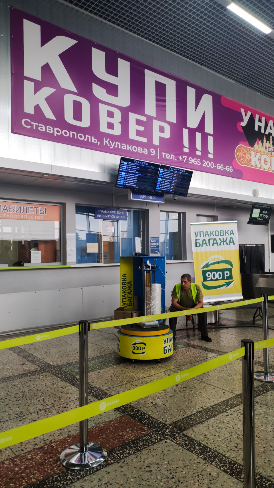 Сервис упаковки багажа в терминале с ценником и рекламными вывесками