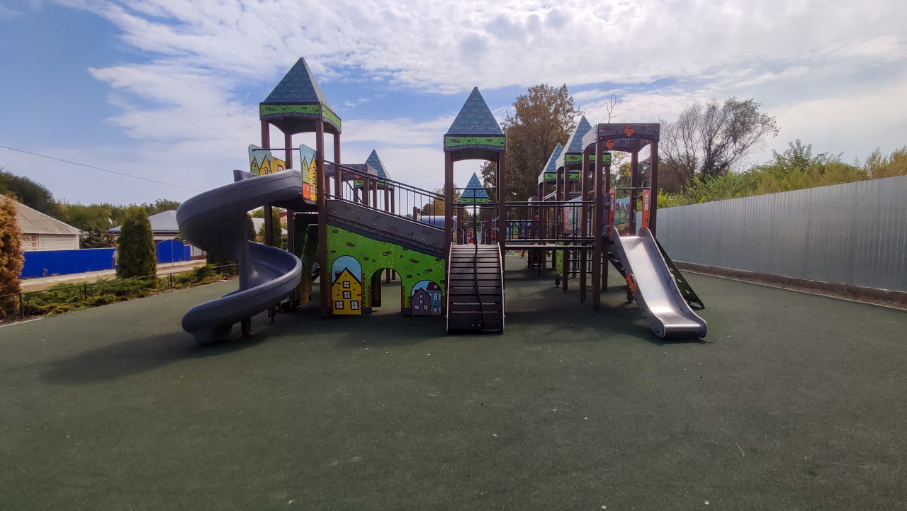 благоустройство детская площадка детские развлечения детский отдых детский досуг детское оборудование игровая зона игровое оборудование игровая площадка игровой комплекс развлечение физическая активность инфраструктура посёлок общественное пространство детский городок горка винтовая горка металлическая горка башня лестница трап переход поручни игровые панели яркие цвета резиновое покрытие резиновая крошка безопасное покрытие ограждение забор частный сектор дома деревья уличные игры семейный отдыхПохожие фотографии