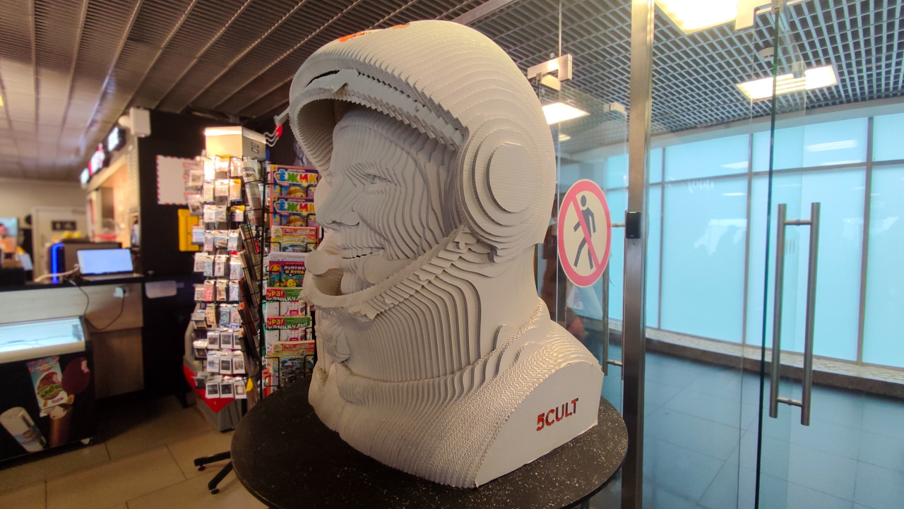 Скульптура нахимовца на фоне ледяного корабля и архитектуры Петербурга