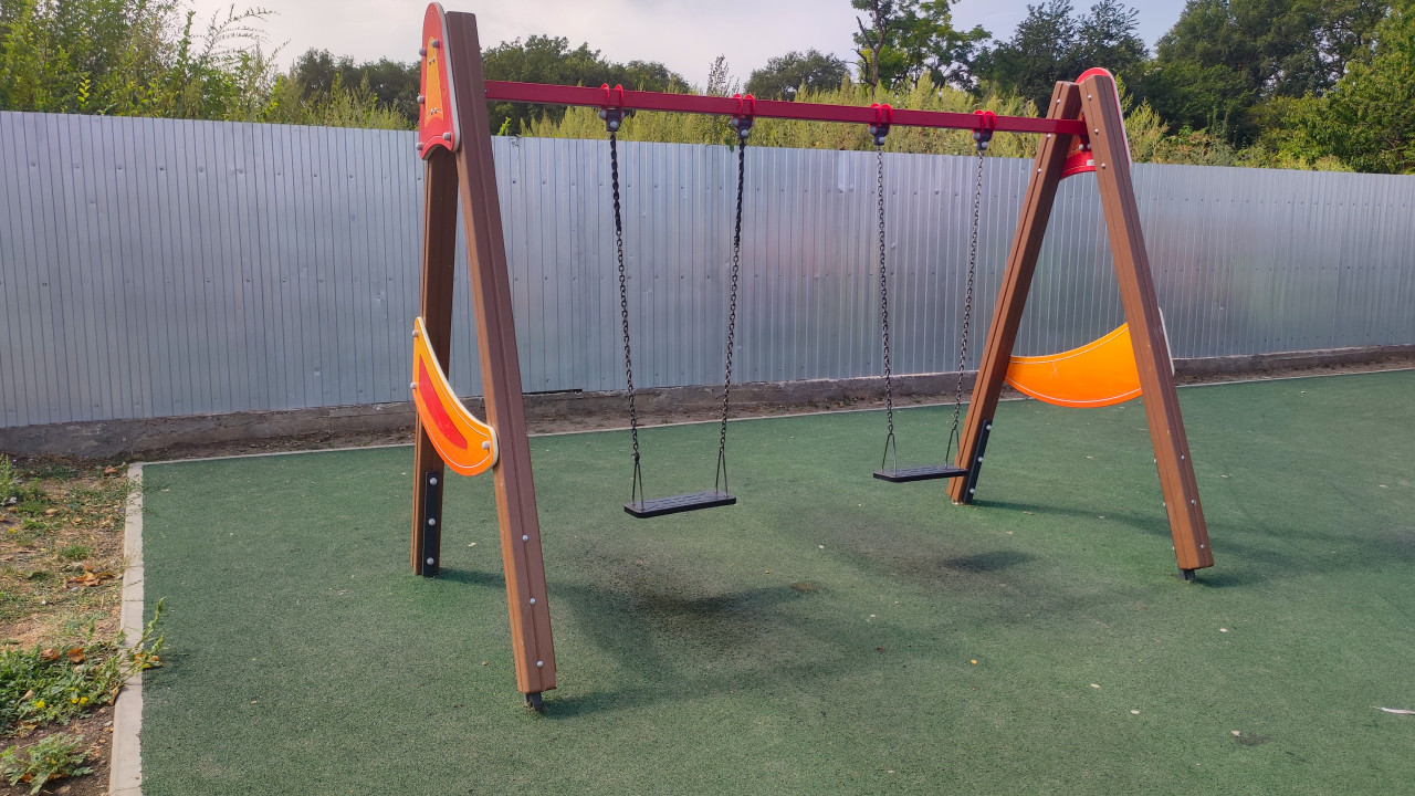 благоустройство детская площадка детские развлечения детский отдых детский досуг детское оборудование игровая зона игровое оборудование игровая площадка игровой комплекс развлечение физическая активность город двор качели подвесные качели цепи сиденье качелей инфраструктура городская среда резиновое покрытие зеленое покрытие износ покрытия пятна тень бордюр ограждение забор профлист деревья кусты пустая площадка безопасность обслуживание уборка дворовая территория частный секторПохожие фотографии