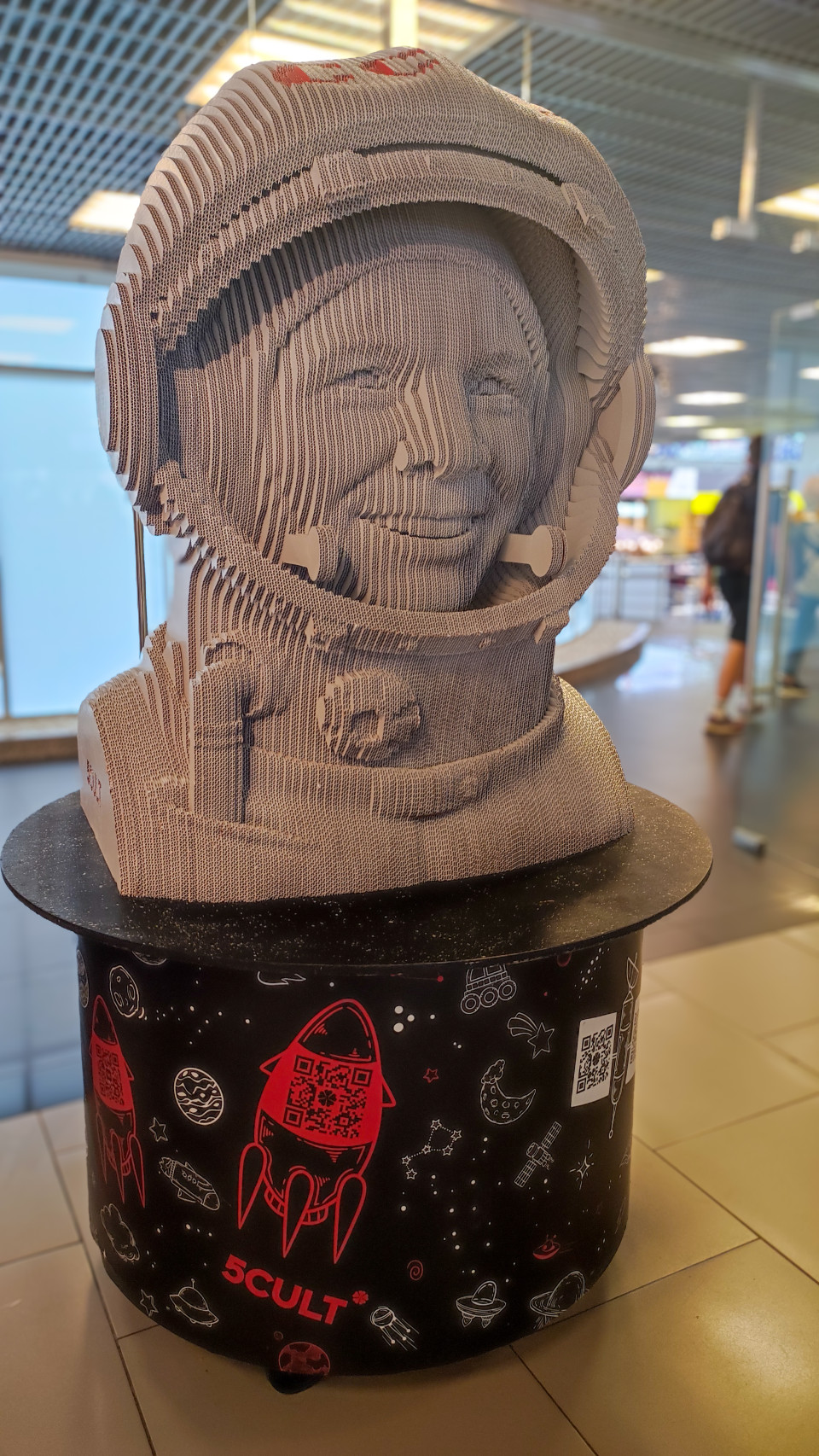 искусство инсталляция арт объект скульптура современный дизайн арт Юрий Гагарин Гагарин первый космонавт космос космонавтика портрет лицо шлем картон гофрокартон слои фактура рельеф ручная работа современное искусство дизайн интерьер аэропорт терминал общественное пространство тумба графика QR код 5CULTПохожие фотографии