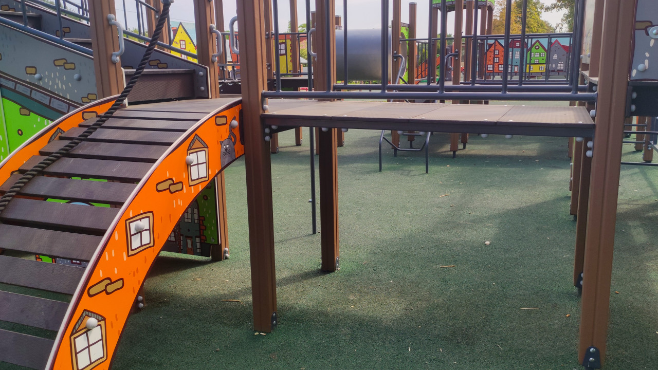 Фрагмент детского игрового комплекса в посёлке: подвесной мостик и площадка с металлическими поручнями, канатной перемычкой и яркими панелями с рисунками домиков. Видны стойки, перекладины, соединения, болты и крепёж, а также наклонный вход на площадку. Под ногами тёмно-зелёное резиновое покрытие из крошки, на поверхности заметны мелкие листья и соринки. На заднем плане просматривается ограждение и зелень. Фото можно использовать для тем про оборудование детских площадок, безопасность и благоустройство общественных пространств.